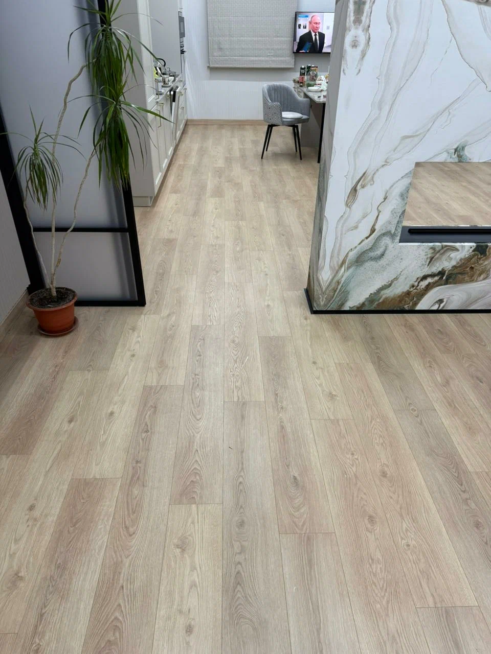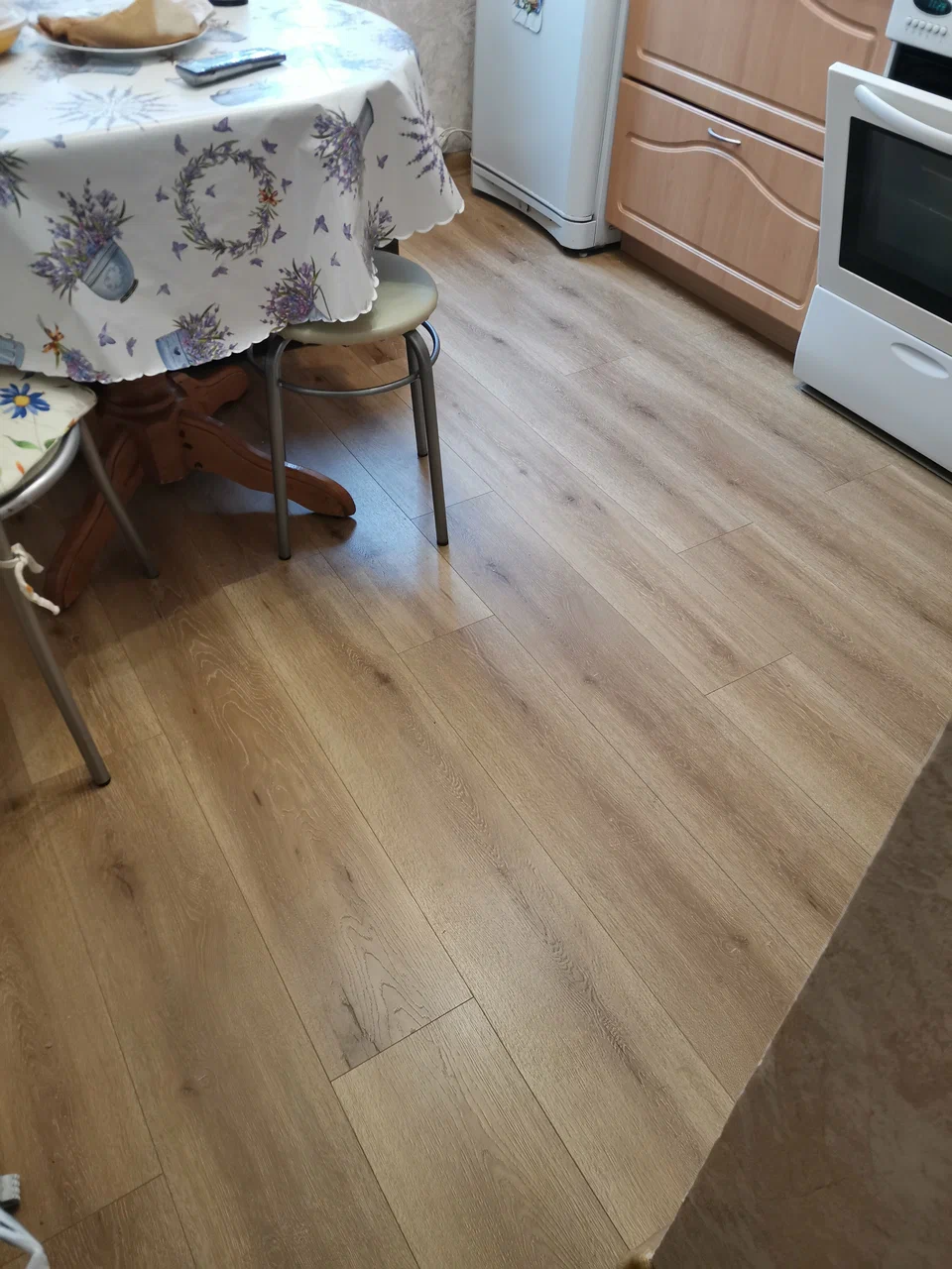 Уложили MSPC на кухню, не ожидали такую ощутимую разницу с обычной плиткой, гораздо теплее. Спокойно выдерживает нагрузку тяжёлого стола из массива.