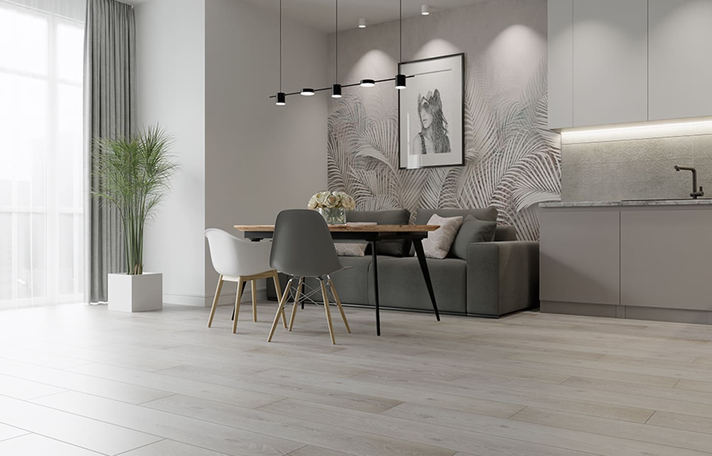 Не бойтесь использовать светлые оттенки Зимнего Вечера. Так как верхний рабочий слой ламели имеет надежный anti scratch эффект, можно не бояться быстрой потери привлекательного внешнего вида. Ваши полы многие годы будут выглядеть как новые. Не забудьте про полную водостойкость, термостабильность и возможность без пороговой укладки до 200 м2.