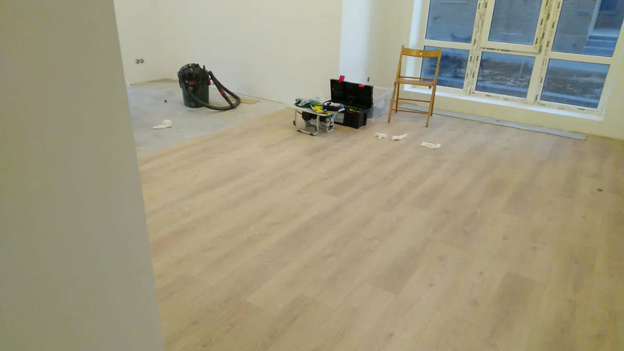 Нет ни одного порога в квартире. Полностью по всей площадью водяной тёплый пол. Не очень сильно разбираюсь в этих современных материалах, поэтому дали совет поначалу кварц-винил. Оказалось, что под тёплый пол как основной источник тепла он не подходит. Узнал про минерально-каменный материал, бо...